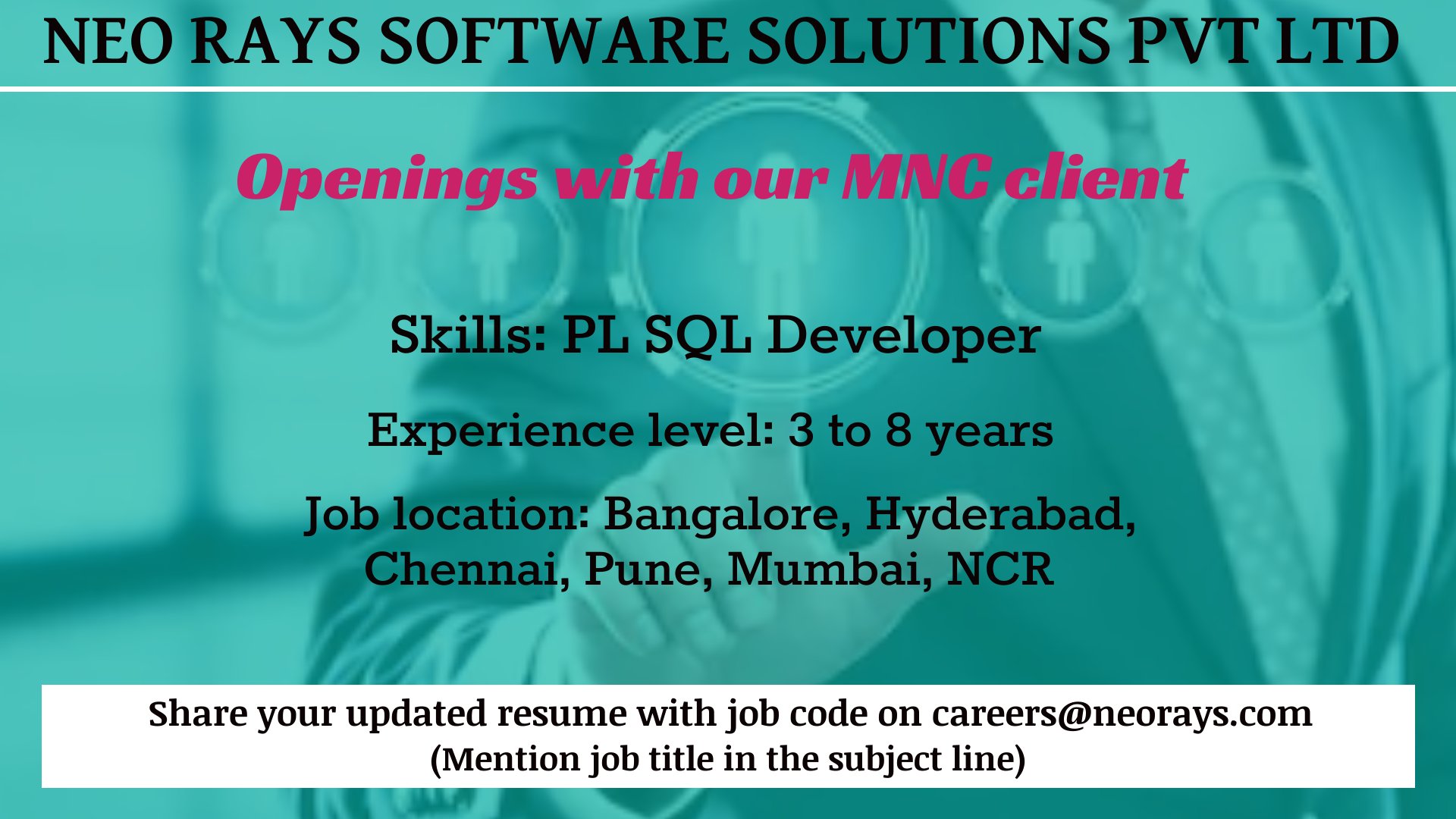 Neo Rays Software Solutions Pvt Ltd On Twitter Jobsearch Jobvacancy Jobseeking Jobfairs Jobopportunity Walkins Hiring Jobopenings Careeropportunities Interviewing Interviews Pl Sql Sqldeveloper Developer Itdevelopment Resume Shares